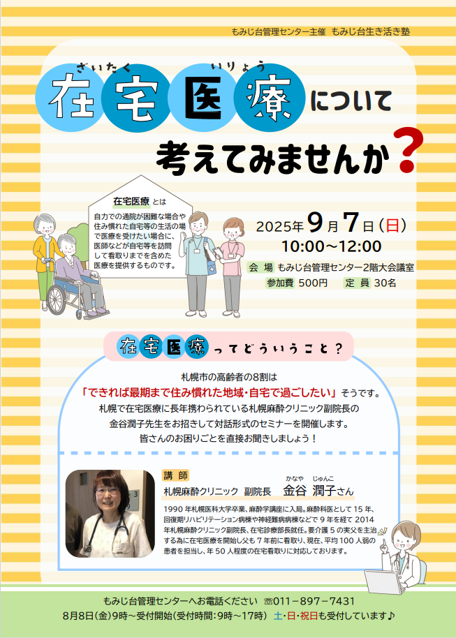 札幌で在宅医療に長年携わられている札幌麻酔クリニック副院長の金谷潤子先生をお招きして対話形式のセミナーを開催します。