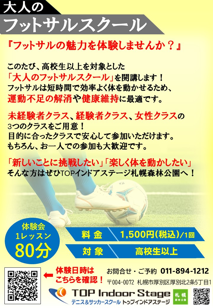 | 開催場所 | テニス&サッカースクール トップインドアステージ札幌森林公園 |