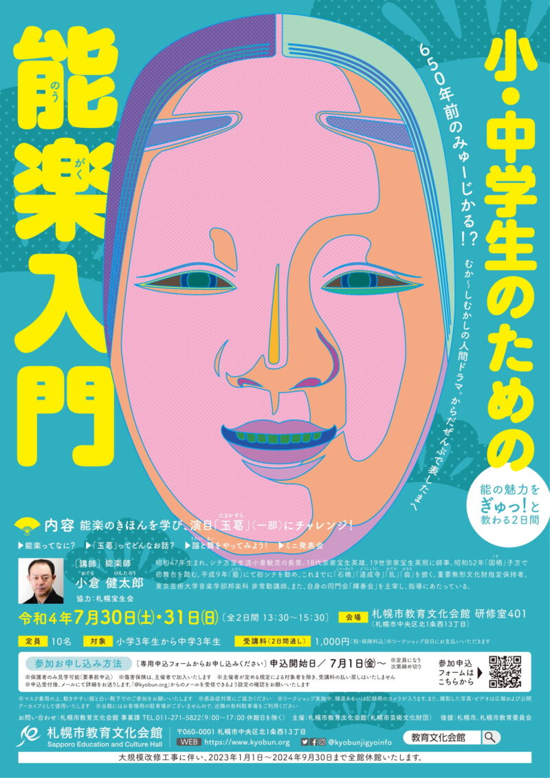 対象は小学3年生~中学3年生。「能を見たことがない…」「全然わからない…」そんなはじめての方でも大丈夫!