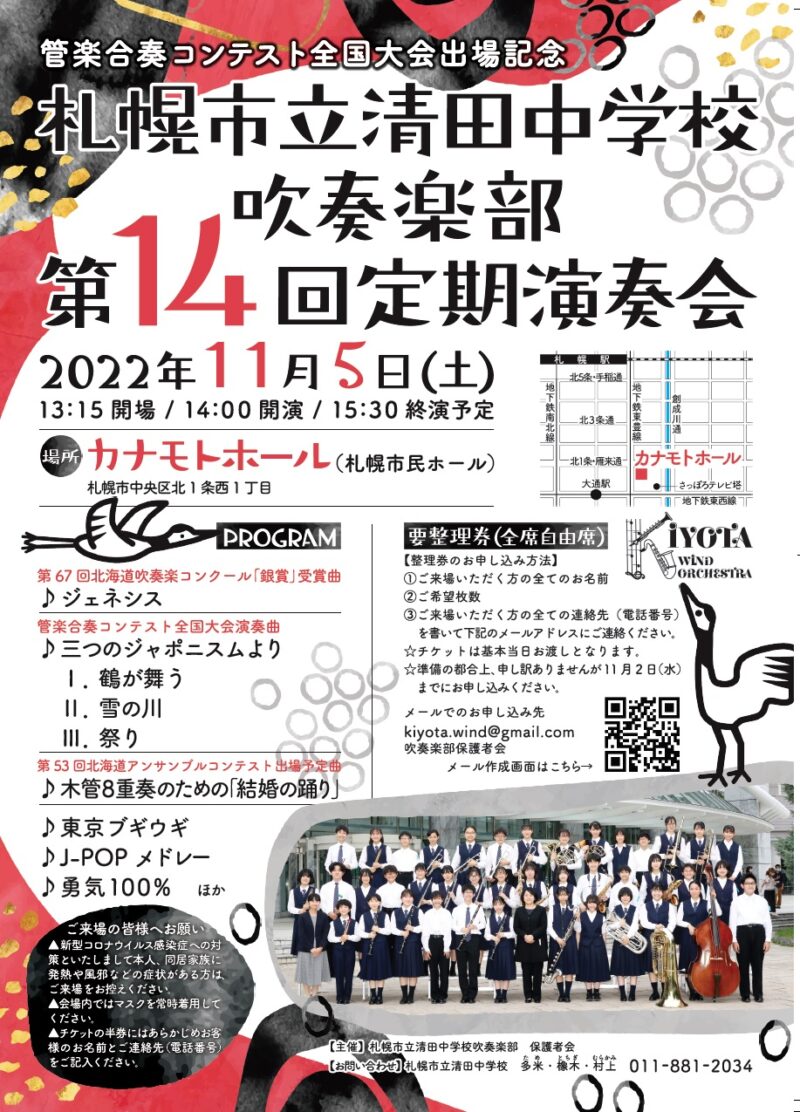 札幌市立清田中学校の定期演奏会です。今回は無観客ではなく、有観客で行います。整理券が必要となりますので、ご来場希望の方はチラシにあるメールアドレスに申し込みをお願いいたします。10月29日に行われる日本管楽合奏コンテストで演奏する三つのジャポニスムやアンサンブルコンテストで演奏した「結婚の躍り」、ポップスは「東京ブギウギ」「にじ」なども演奏します。ぜひお誘いあわせの上、ご来場ください。お待ちしております!