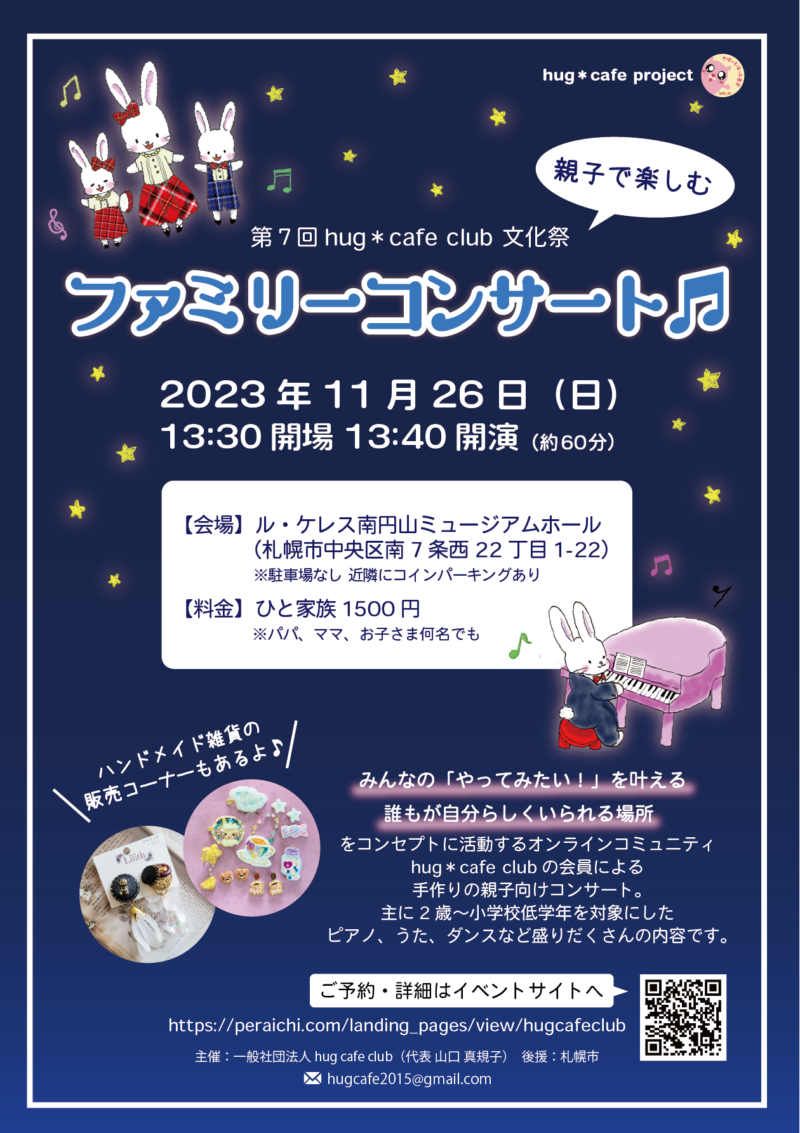みんなの「やってみたい!」を叶える 誰もが自分らしくいられる場所をコンセプトに活動するオンラインコミュニティhug*cafe clubの会員による、手作りの親子向けコンサート。