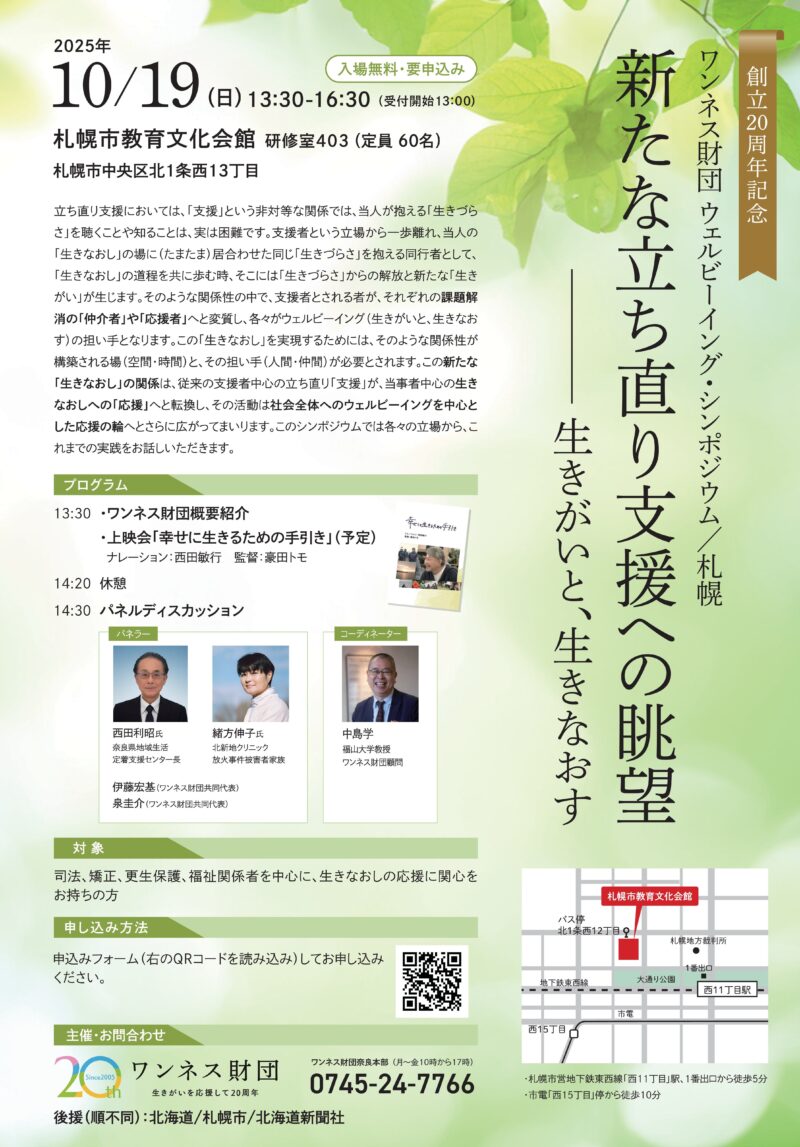 今回のシンポジウムは、「新たな立ち直り支援への眺望 ー生きがいと、生き直すー」 をテーマに、これまでの支援のあり方を振り返り、更なる選択肢を考えていく機会にします。