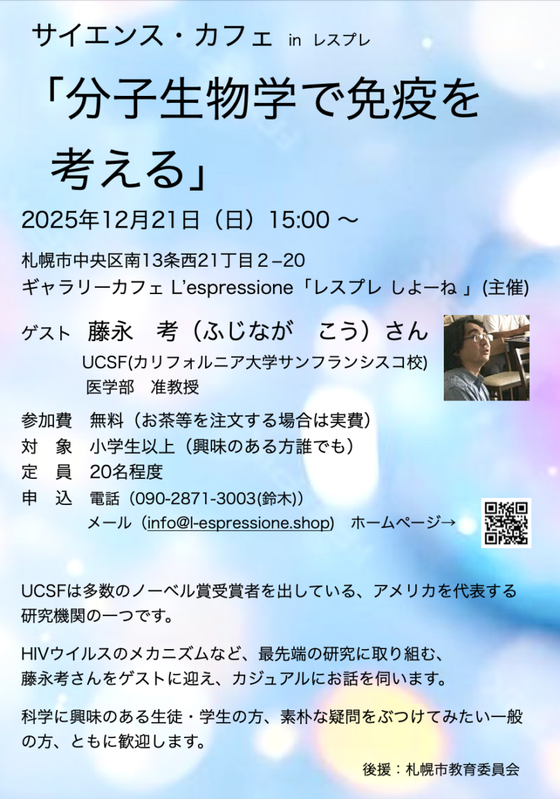 UCSF(カリフォルニア大学サンフランシスコ校)医学部 准教授の藤永考(ふじながこう)さんをゲストに迎え、「免疫」をテーマに、分子生物学研究の立場から見た、最前線の研究のお話を伺います!