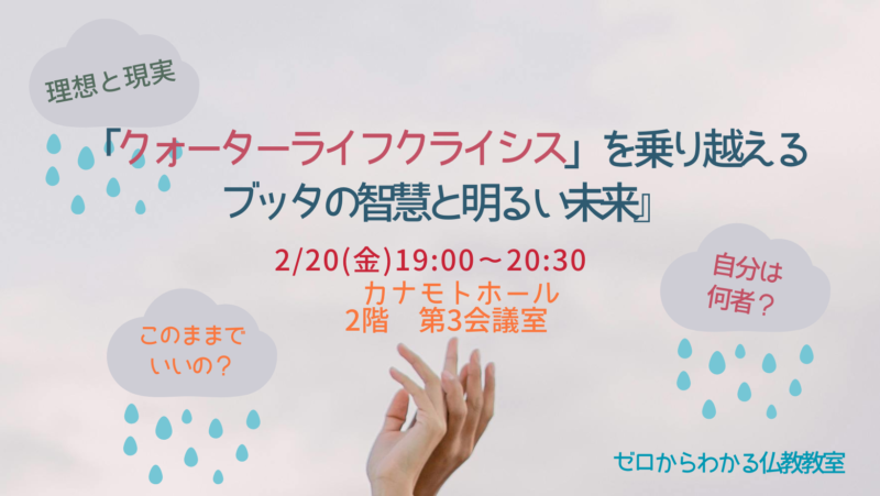 理由ははっきりしないのに、不安や焦り、虚しさを感じる時期があります。「このままでいいのだろうか?」「自分は何者なのか?」「本当は、どう生きたいのか?」こうした心の揺らぎは、20代後半から30代前半に訪れる「クォーターライフクライシス」、また30代後半から40代にかけての「ミッドライフクライシス」として、多くの人が経験しています。この迷いや不安を、弱さや失敗ではなく、人生を見つめ直す大切な機縁と受け止め、前向きに乗り越える道を示されたブッダの智慧を学んでみませんか?