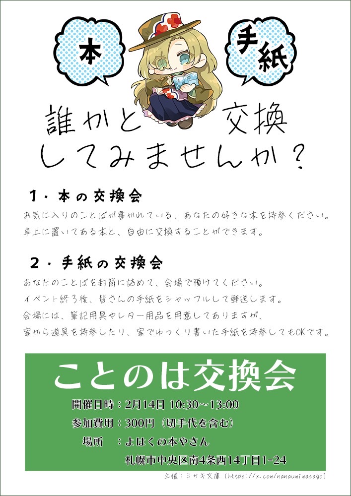 ※本の交換会だけ・手紙の交換会だけの参加も可能ですが、参加費用は同額(片方だけの参加でも300円)になります。