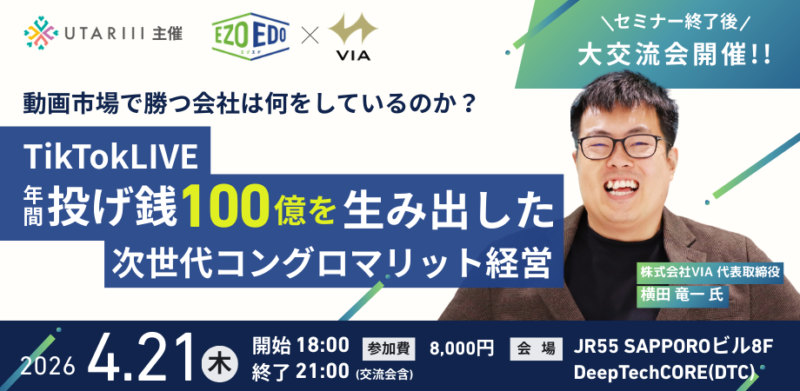 北海道と東京のビジネスを繋ぐ『EzoEdo』。今回は、動画を軸に多角的なコングロマリット経営を展開し、急成長を遂げている株式会社VIAより、代表取締役社長の横田氏をお招きします。