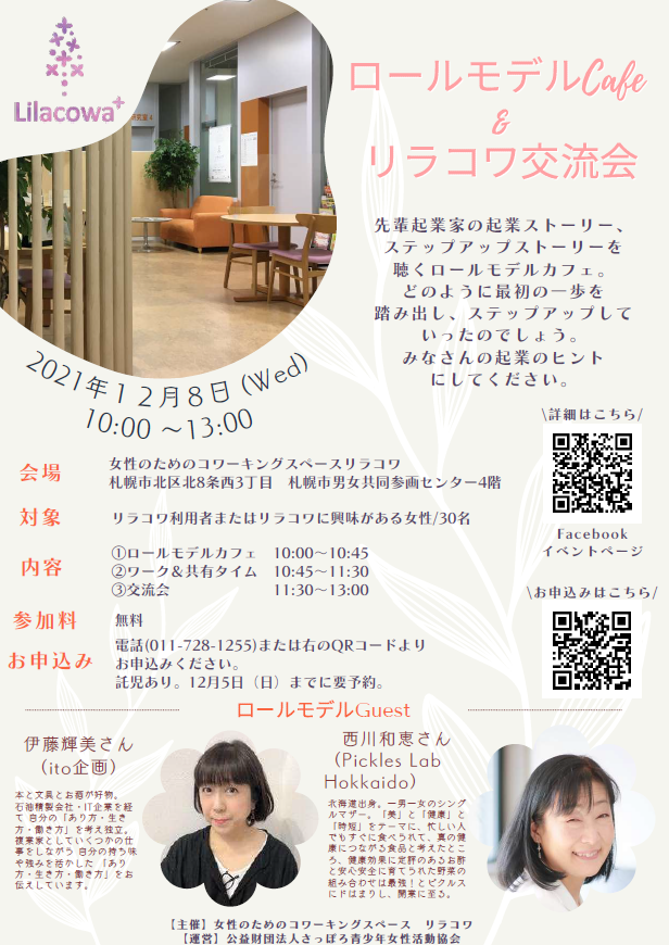 | 開催場所 | 女性のためのコワーキングスペースリラコワ |