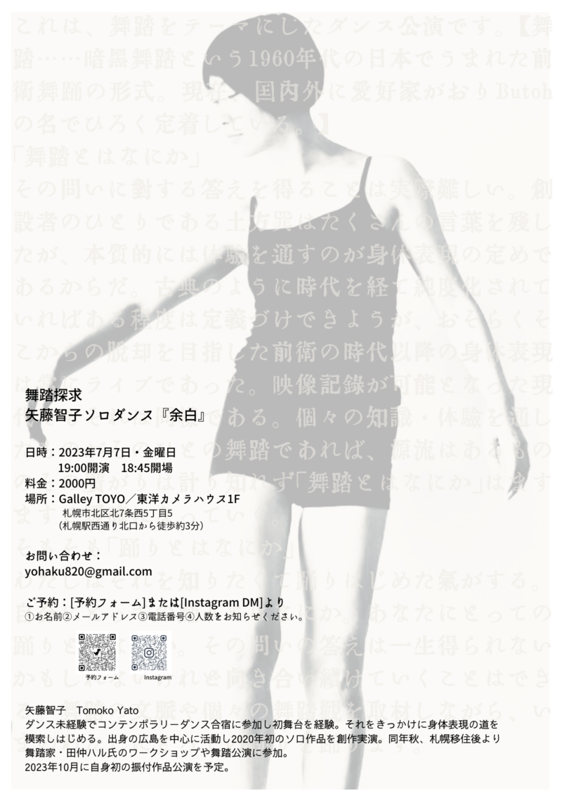 ダンス未経験でコンテンポラリーダンス合宿に参加し初舞台を経験。それをきっかけに身体表現の道を模索しはじめる。出身の広島を中心に活動し2020年初のソロ作品を創作実演。同年秋、札幌移住後より舞踏家・田仲ハル氏のワークショップや舞踏公演に参加。