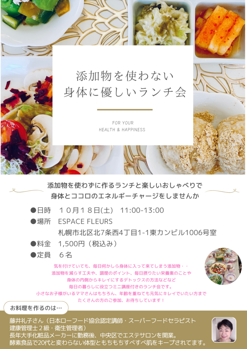 こちらのランチ会は、添加物を減らす工夫や、調理のポイント、毎日摂りたい栄養素のことや身体の内側からキレイにするデトックスの方法などなど、毎日の暮らしに役立つミニ講座付きになります♪