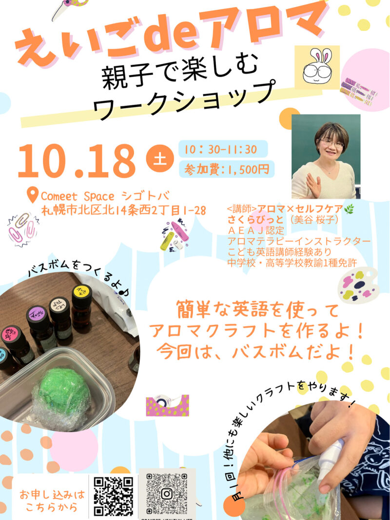親子で楽しめる、簡単な英語でアロマクラフトを作る、お子さま向け講座です。アロマテラピーインストラクターの資格を持った、現役英語講師が、やさしく楽しく指導します。お子さまにとっては、聴覚(英語)、嗅覚(アロマ)、触覚(クラフト)をフル稼働して、楽しく学べる講座となっております。今回のクラフトは『バスボム』。作るところから、お風呂でシュワシュワするところまで、ご家族とのコミュニケーションツールにしていただければ、幸いです。