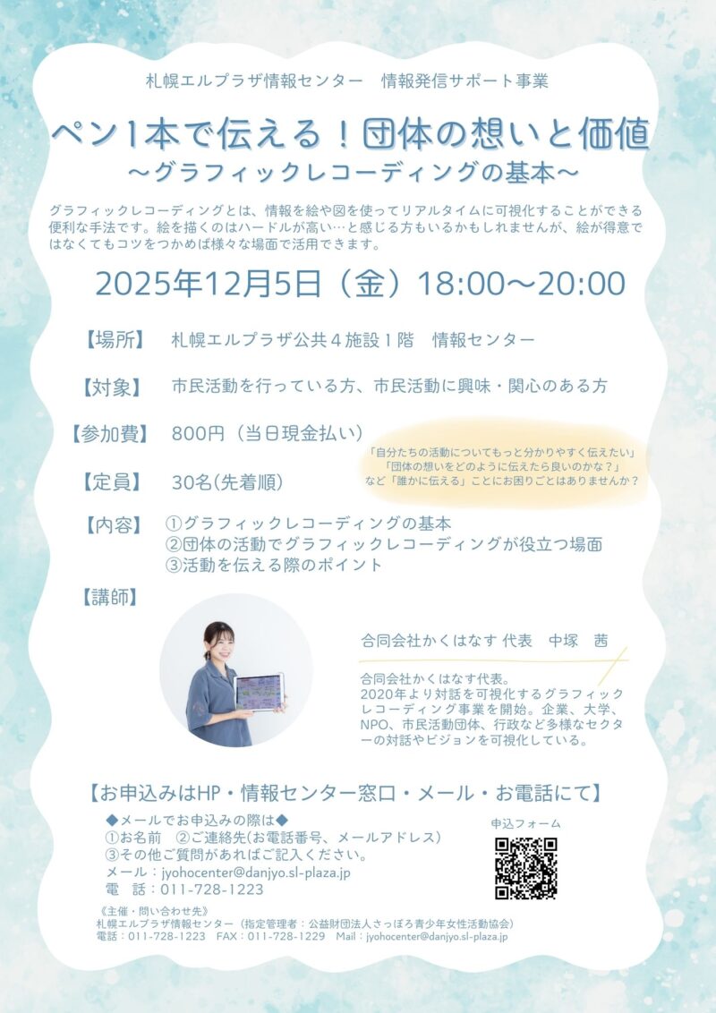 情報の要点を絵や文字で整理し、新たなアイディアの発見にも繋がり便利な手法である「グラフィックレコーディング」をテーマとした講座を開催します。市民活動団体や市民活動に興味のある方に対して情報発信力を高める機会を提供します。講師には「合同会社かくはなす」代表 中塚茜さんをお招きします。多くのご参加をお待ちしております。