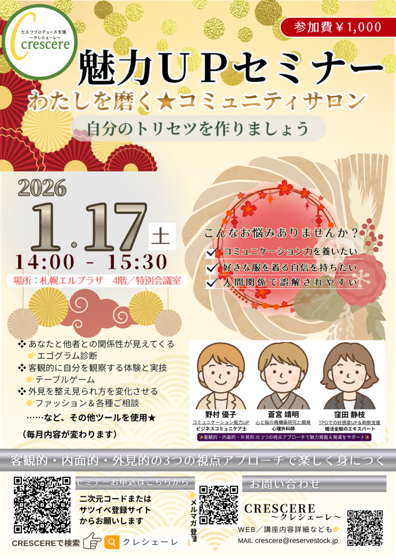 あなたの隠れた魅力を引き出し、成長を応援するクレシェーレの3人の講師によるワークショップ形式のセミナー勉強会です