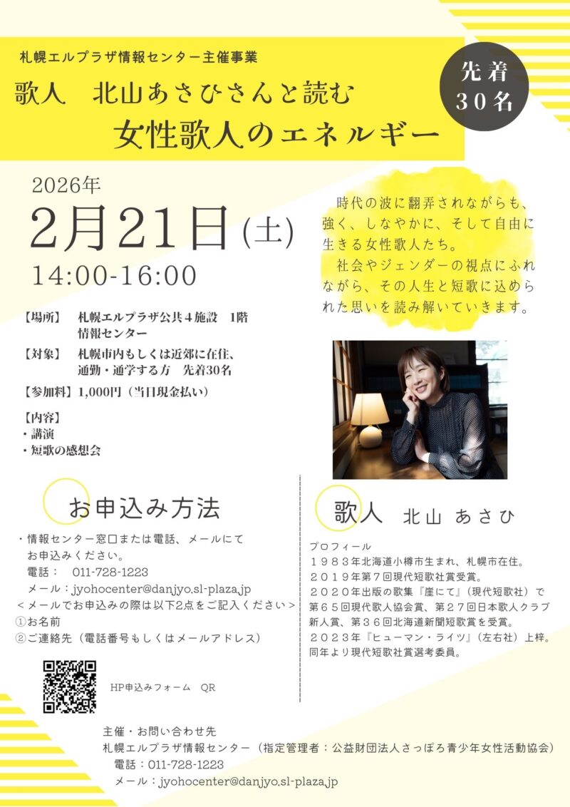札幌エルプラザ情報センターでは、小樽出身の歌人 北山あさひさんを講師に迎え、北山さん自身や様々な時代の女性歌人の短歌からジェンダーや社会問題について参加者と一緒に読み解いていきます。