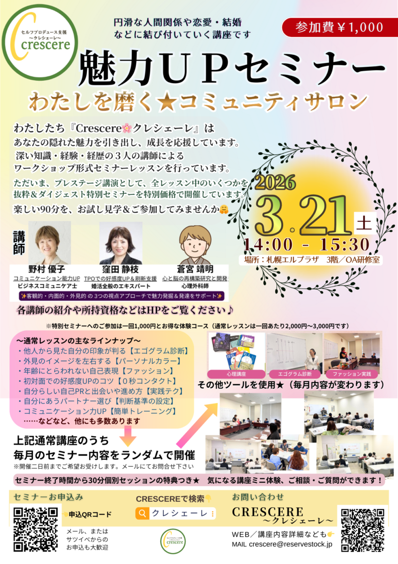 あなたの隠れた魅力を引き出し、成長を応援するクレシェーレの3人の講師によるセミナー勉強会です