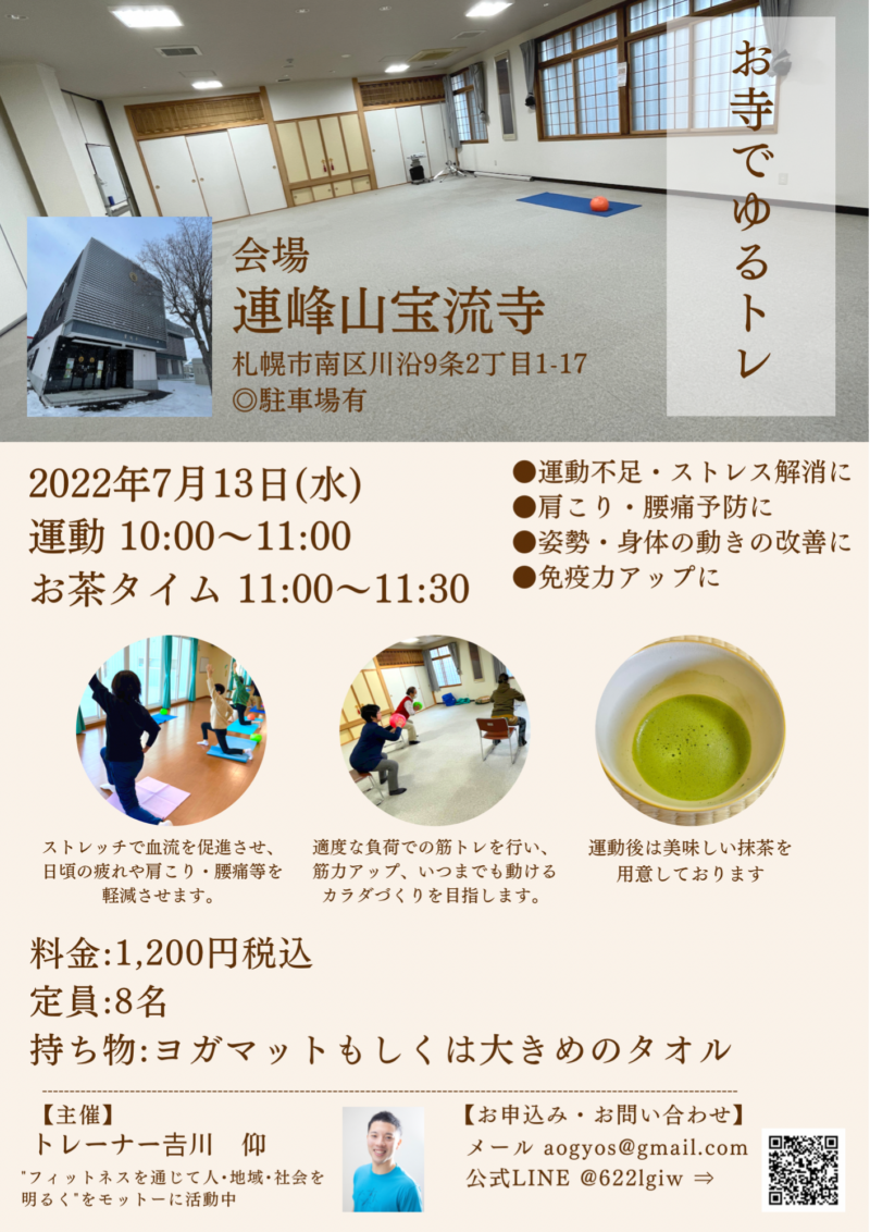 ゆったりとした動きがほとんどですが、正しく動かし、参加者の皆さんと楽しく運動することで、カラダもココロもすっきりしていただける内容となっております。