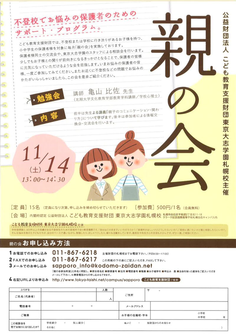 お子さんが学校を休みがちな保護者を対象にした「親の会」です。