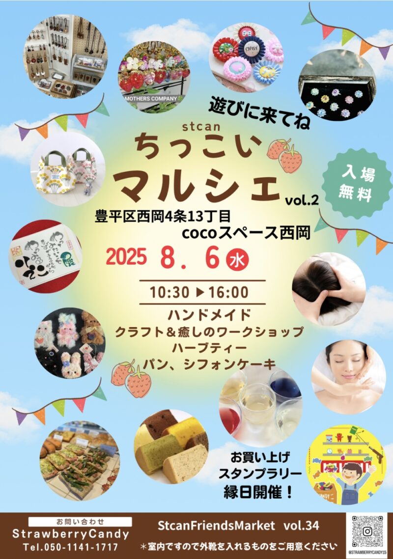作る、癒されるワークショップをはじめ、手作り品、パンやシフォンケーキ、縁日など、お子様からお店の方まで楽しめるマルシェです。お買い上げスタンプラリーで作家さんの手作り品や雑貨などが当たるお楽しみもありますので遊びに来てください。