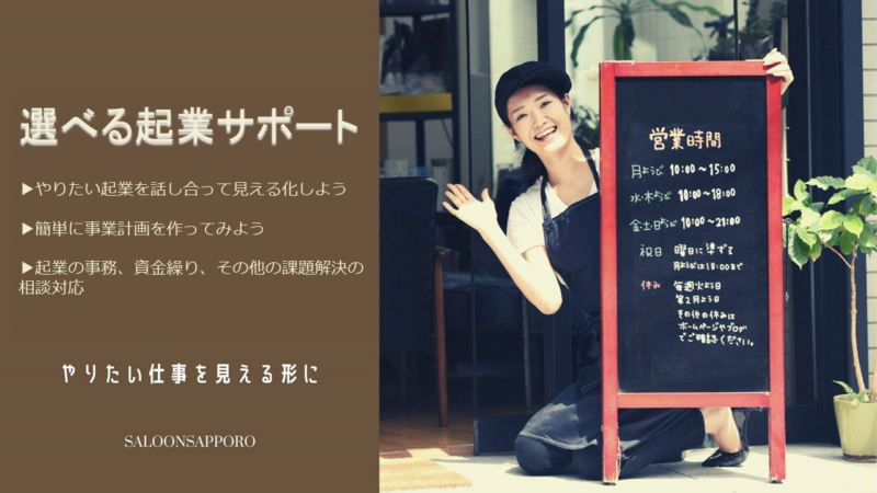 主に起業に当たっての入り口となるビジネスモデルの明確化から、事業計画の作成、必要な諸手続き、資金確保、公的な支援などについてのアドバイスを当事務所で行うことで、別サービスであるSALOON札幌の管理人の個別コンサルティングと合わせて起業、副業、複業をしようとしている方を、サポートします