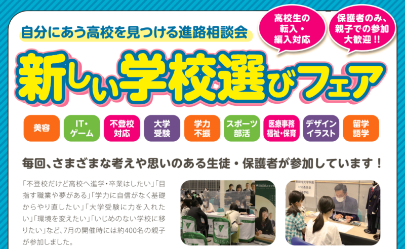 『現在、不登校だけど高校へ進学・卒業はしたい』『勉強に自信がないので基礎からやり直したい』『人間関係がうまくいかないので環境を変えたい』等の思いがありましたら、ぜひ今後の進路選択に役立つ『新しい学校選びフェア』をご活用ください。