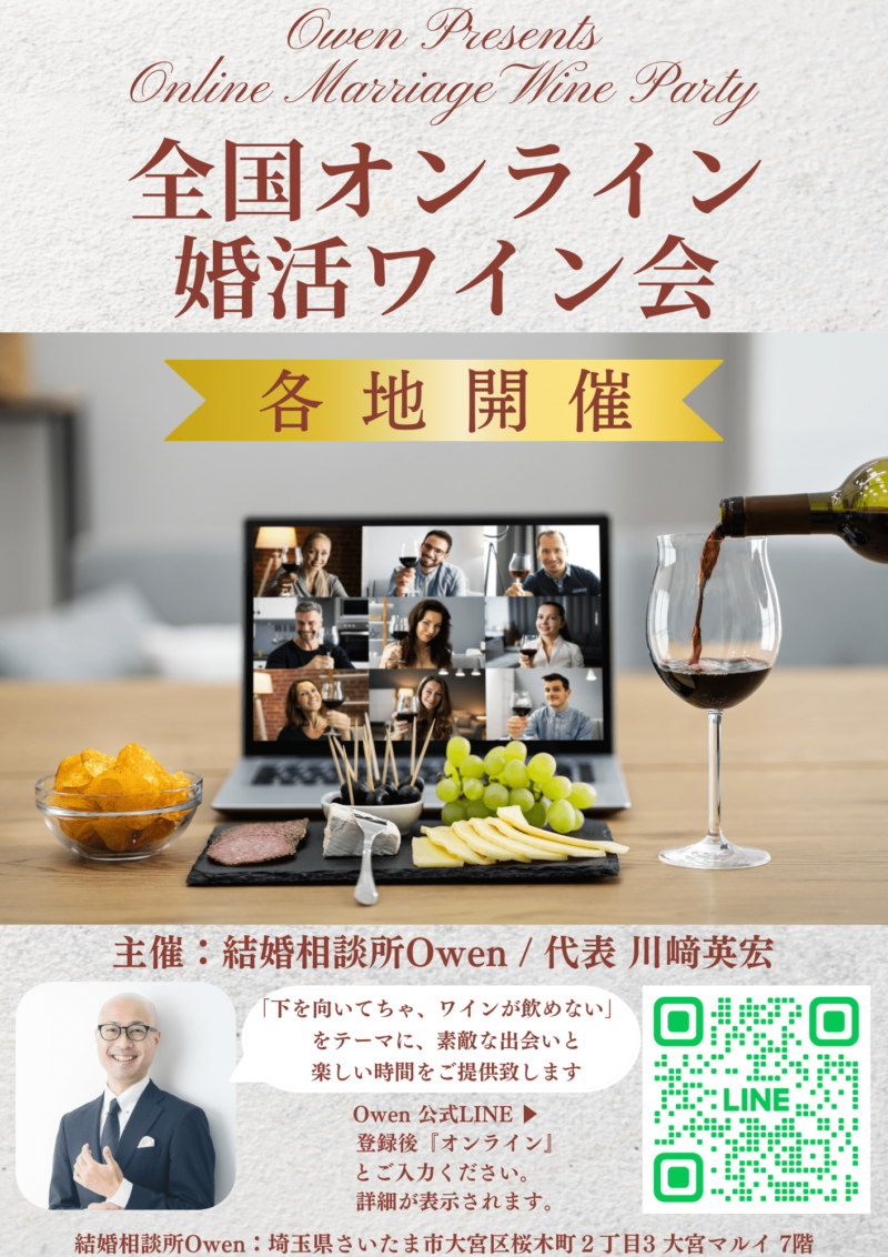 結婚相談所Owen(オーウェン:代表 川﨑英宏)のオンライン婚活ワイン会です。