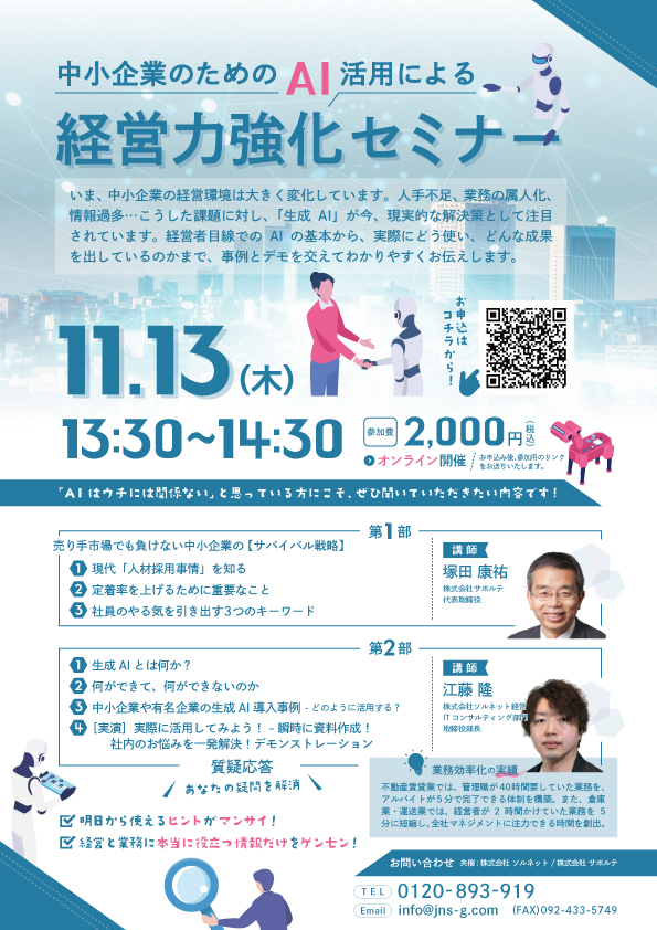 | 公式WEBサイト | https://supporte.jp/%e4%b8%ad%e5%b0%8f%e4%bc%81%e6%a5%ad%e3%81%ae%e3%81%9f%e3%82%81%e3%81%aeai%e6%b4%bb%e7%94%a8%e3%81%ab%e3%82%88%e3%82%8b%e3%80%8c%e7%b5%8c%e5%96%b6%e5%8a%9b%e5%bc%b7%e5%8c%96%e3%82%bb%e3%83%9f%e3%83%8a/ |