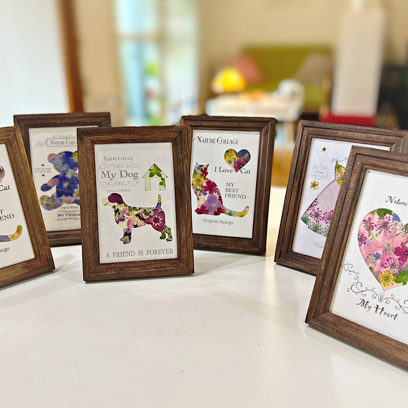 内容:押し花でおしゃれなミニフレームを2つ作ります。テディベア、ネコ、ハートなどのモチーフから2種類お選びいただけます。
